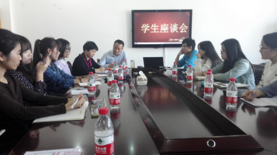 在11-412会议室召开学生座谈会,会议由院长助理陈涛老师和院督导主任徐群芳老师主持,参加座谈会的主要是各班级的学习委员。