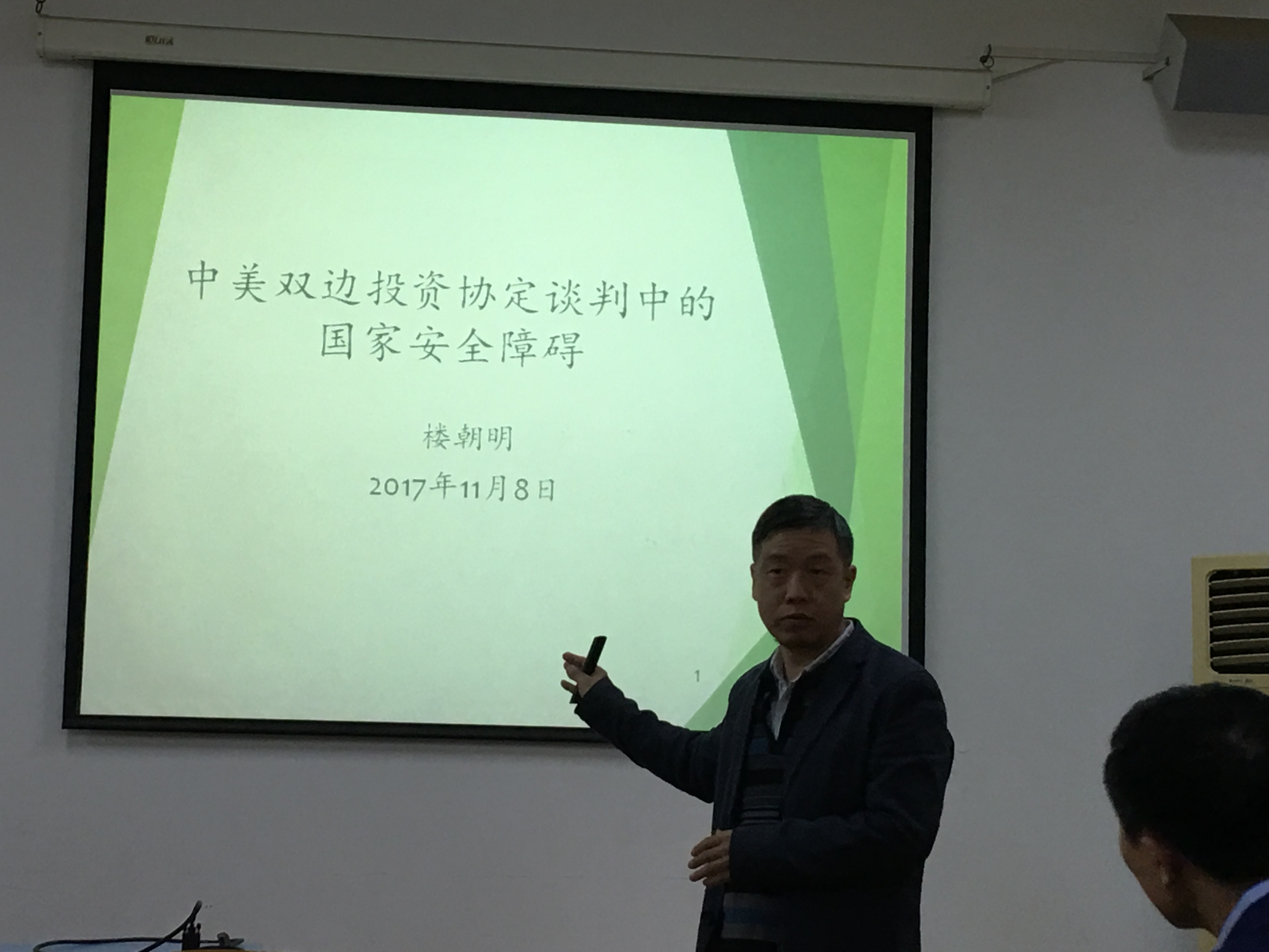 楼朝明副教授的讲座题目是《中美双边投资协定谈判中的国家安全障碍》,这是他主持的国家社科基金后期资助项目《中美双边投资中的国家安全问题》书稿中的一章。他首先对2006年和2016年《财富》500强之前10强进行了比较,并简单分析了2008-2016年中美双边直接投资流量情况。由此,他指出了中美双边投资协定谈判的分歧焦点:负面清单、公平竞争和国有企业、投资权益保护、劳工和环境标准、“符合东道国法律”要求等。他提出,国家安全问题是中美双边投资协定谈判中的重要分歧。美国国家安全审查制度对中国企业在美投资构成了挑战,而美国对华投资可能损害中国国家安全利益。他认为,中美双方要达成高标准、现实的双边投资协定,这将是一个非常艰巨的谈判过程。