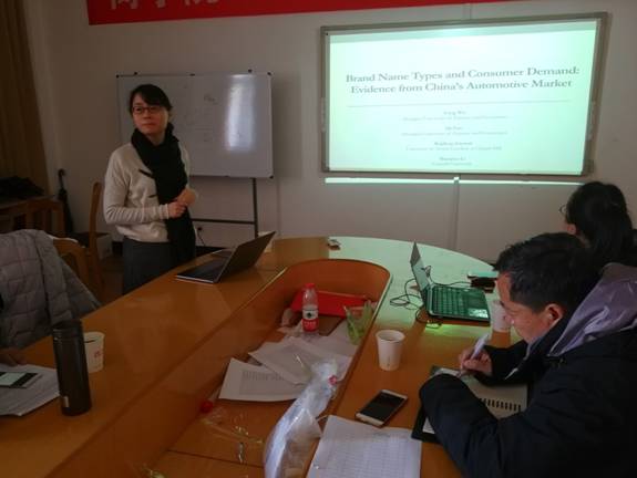 学术沙龙(2018年第1期)在11#518会议室举行。本期学术沙龙主讲人是上海财经大学国际工商管理学院硕士生导师吴芳副教授。沙龙主题为“品牌名与消费者需求:基于中国汽车需求市场的研究”。学术沙龙由企业管理研究所教师马永斌副教授主持,我院企业管理研究所及其他研究所教师、部分研究生参加了此次学术活动。