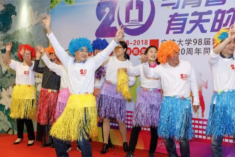 主题班会结束后,全体同学在大草坪、南天门等地合影留念,之后大草坪上的集体游戏。大家一个个成了40+的疯孩子。在宁大宾馆“白鹭厅”的晚宴上,94会计的同学们邀请六位恩师出席。大家一边齐声喊着“老师,我们永远爱您”,一边鞠躬表达深深的谢意。晚餐结束后,同学们还久久地坐在白鹭厅聊天交流,忆往昔盼未来。尽管夜色朦胧,温度渐低,但屋内却暖意融融。