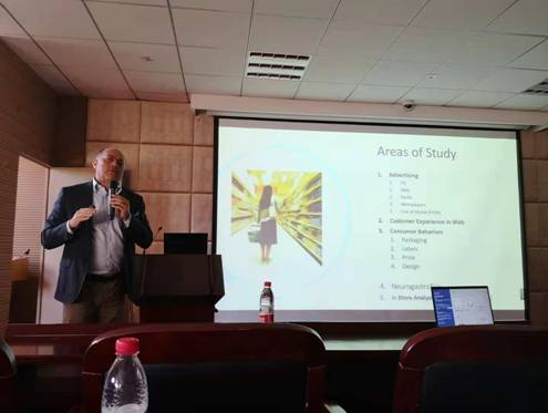 学术报告在包玉书科技楼11号109会议室顺利举行。报告的题目为“The study on advertisement by using simultaneously eye-tracking, EEG/ERP, and GSR”。本次学术报告由我院主办,宁波大学神经经济管理学研究院承办,主讲人为米兰国际语言与传播大学消费与神经营销心理学教授Vincenzo Russo,报告由郁雯珺老师主持,研究院院长马庆国教授致欢迎词。我院部分老师、部分本科学生及研究生参加了此次学术活动。