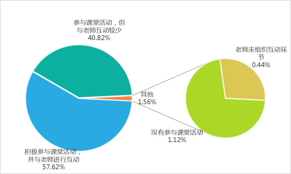 问卷结果表明,57.7%的学生对积极与老师进行互动、40.8%人互动较少,只有1.5%的同学没有与老师互动。