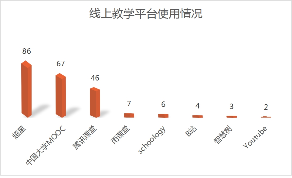 采用的线上教学平台主要包括:超星(38.9%)、中国大学MOOC(30.3%)、腾讯课堂(20.8%)、其他(10%)。