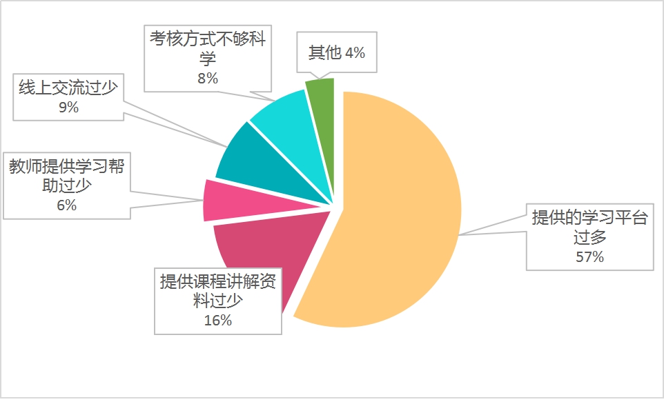 问卷结果表明,57%的学生认为线上教学存在的最大不足是平台太多,不同课程之间切换麻烦。