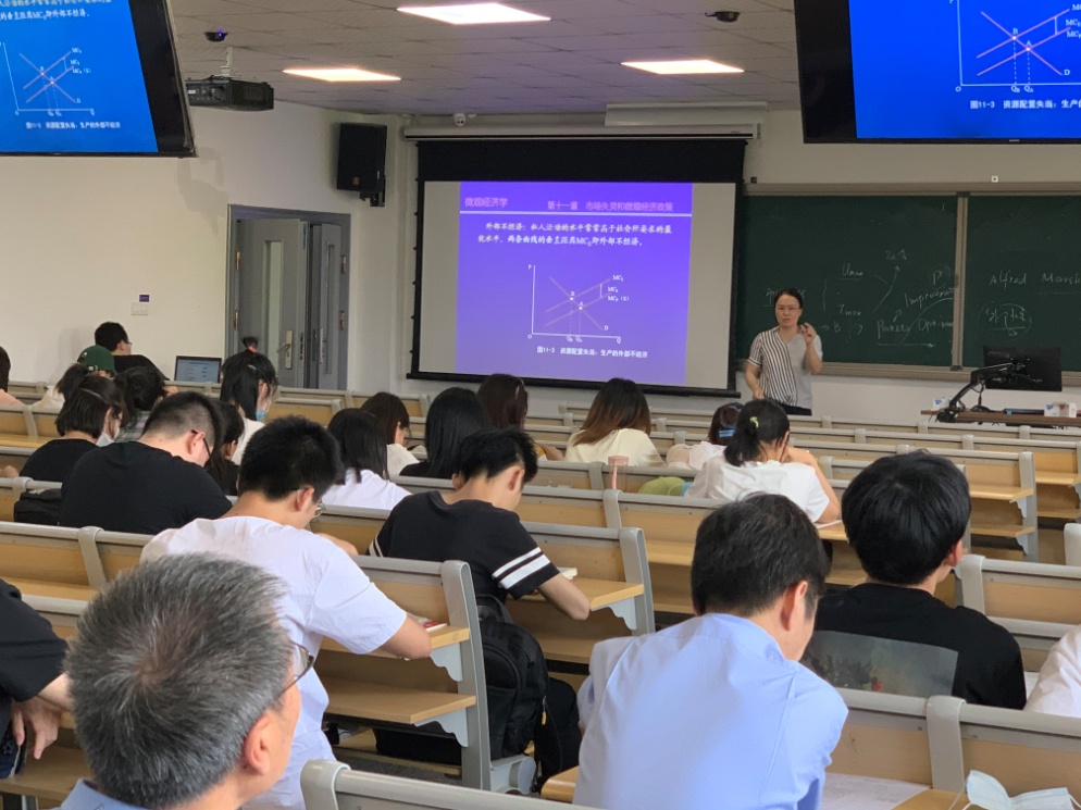 此次公开观摩课的课程名称是《微观经济学》,该课程是经济管理类的专业基础课。本次课,黄老师主要围绕市场失灵和微观经济政策,从帕累托最优引入分析,简述了市场失灵的含义及其表现,着重介绍了外部影响问题,系统阐释了外部效应的表现、分类、原因、后果及解决机制,引出了庇古税、科斯定理等重要的经济学原理。黄老师结合案例教学,在教学过程中适当融入思政元素,在专业教学的同时贯彻立德树人,并结合课题研究数据,深入浅出、融会贯通地为学生讲解了各相关知识点。整个授课过程,黄老师语言声音洪亮,表述清晰,教学内容娴熟,注重课堂组织与管理,教学效果良好。
