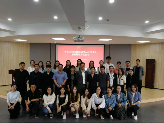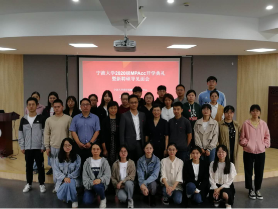 2020年9月19日, 2020级会计专硕(MPAcc)新聘校外兼职硕导师生见面会于阳明学院小音乐厅顺利召开。出席会议的有中国会计学会理事、中国会计学会会计教育专业委员会委员、宁波大学会计国际发展中心研究主任、会计专硕学位点主任邱妘教授、会计专硕学位点执行主任陈翼然老师、中国科学院大学宁波华美医院财务处长袁征、普华永道中天会计师事务所高级经理谢盈、欣捷投资控股集团有限公司总裁助理马煜东以及2020级会计专硕全体学生。会议由陈翼然老师主持。