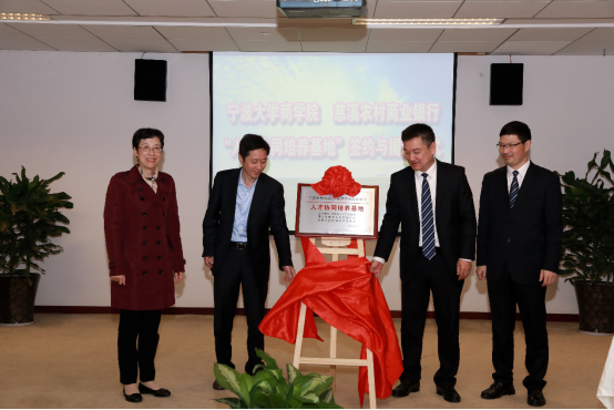 和慈溪农村商业银行共同举行了“人才协同培养基地”签约与揭牌仪式。慈溪农村商业银行董事长应利广,慈溪农村商业银行行长戚建明,人力资源部总经理王红,计划财务部副总经理方艳,计划财务部总经理助理陈云,原财务总监解小平,人力资源部培训管理岗胡金超,体育博彩
