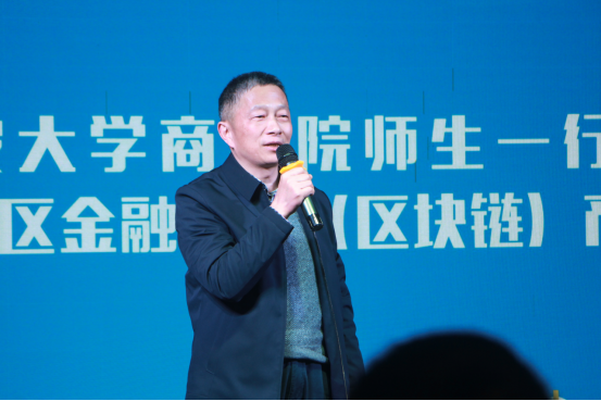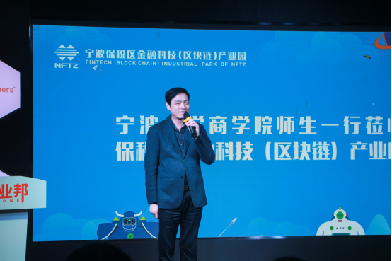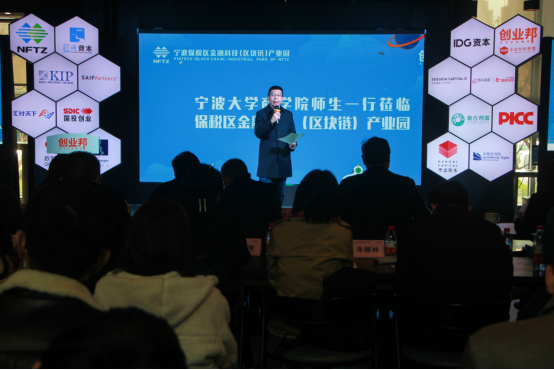 的师生们介绍了金融科技(区块链)产业园,保税区管委会自2017底开始筹建,着力聚焦金融科技和区块链技术的创新应用,携同创业邦共同打造以产业集聚、项目孵化、落地应用为一体的产业生态园,同时与宁波诺丁汉大学合作设立区块链实验室,以及与成都电子科技大学合作搭建保税区数字经济产业园等。通过两年多努力,园区发展势头呈现良好态势,为宁波地区传统产业数字化和互联网化转型提供了有力支撑,并将努力为区域数字经济发展持续贡献力量。现在保税区通过引进金融科技、区块链企业,以新型的科技技术力量赋能本地传统产业,链接本地各方资源,打造金融科技产业生态园区。