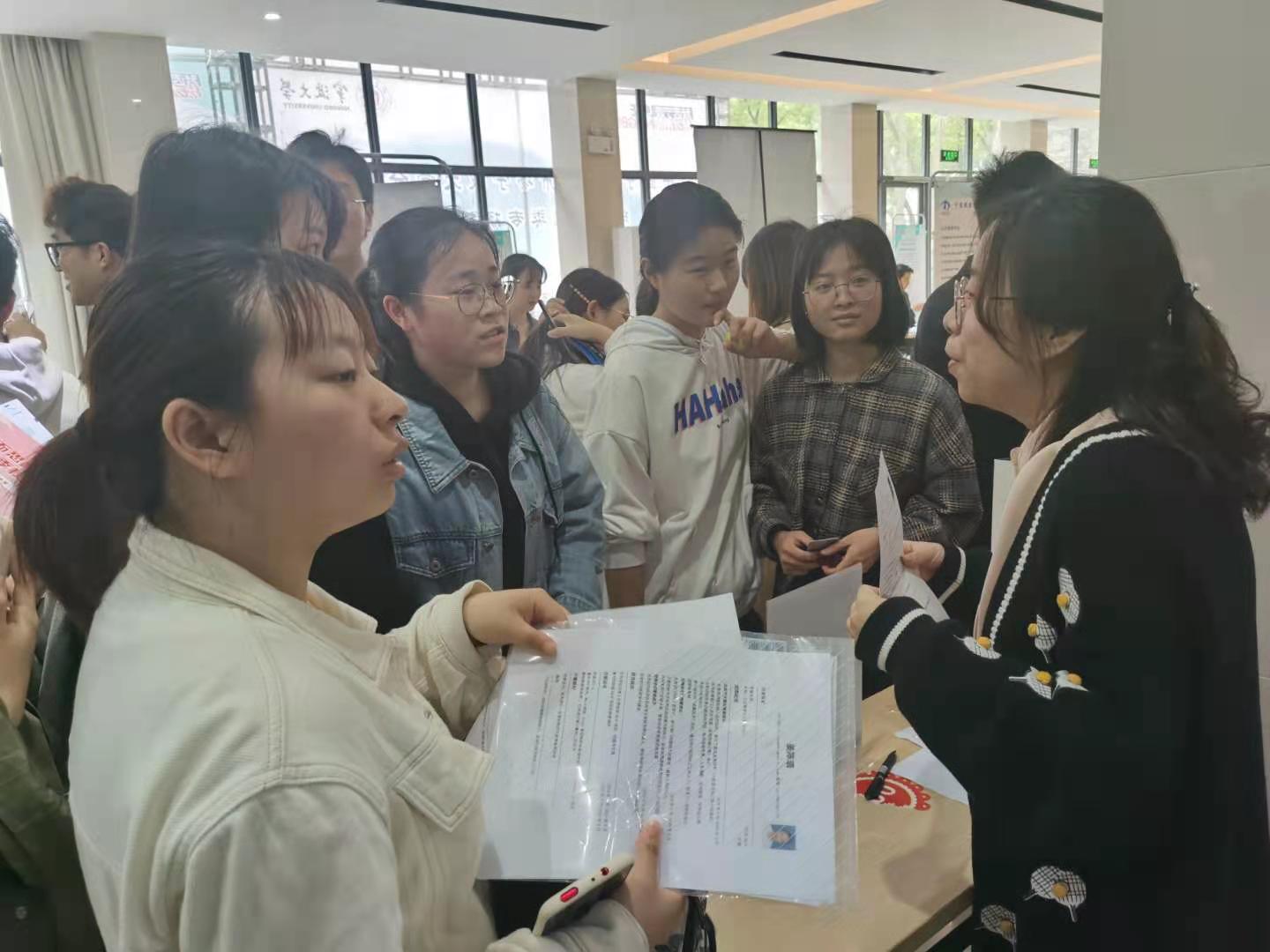 招聘会现场人声鼎沸,来往的学生络绎不绝,整个招聘会井然有序。用人单位布置好自己的会场,HR主动邀请,热情地介绍本公司的详细招聘信息,并为毕业生们详细解答疑难。毕业生们也满怀信心手持自己精心准备好的自荐书和简历,满脸自信地穿梭于人流之中,积极与招聘人员交流,主动了解用人单位的情况,积极寻求合适自己的工作岗位。双向的、面对面的交流是互相了解的最好方式。这不仅让用人单位更直接地了解到毕业生的需求和具体情况,还让同学们更清楚地知道各个企业和岗位的基本要求及实际岗位情况,并对比自身从而更好地选择了更适合自己的岗位。