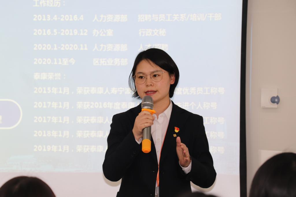 首先,胡晓妍从一个专业培训人的角度出发,介绍了泰康的发展历程、战略布局,通过亲切互动与交流,使得同学们对泰康的发展核心与大健康生态体系有了全面的了解。