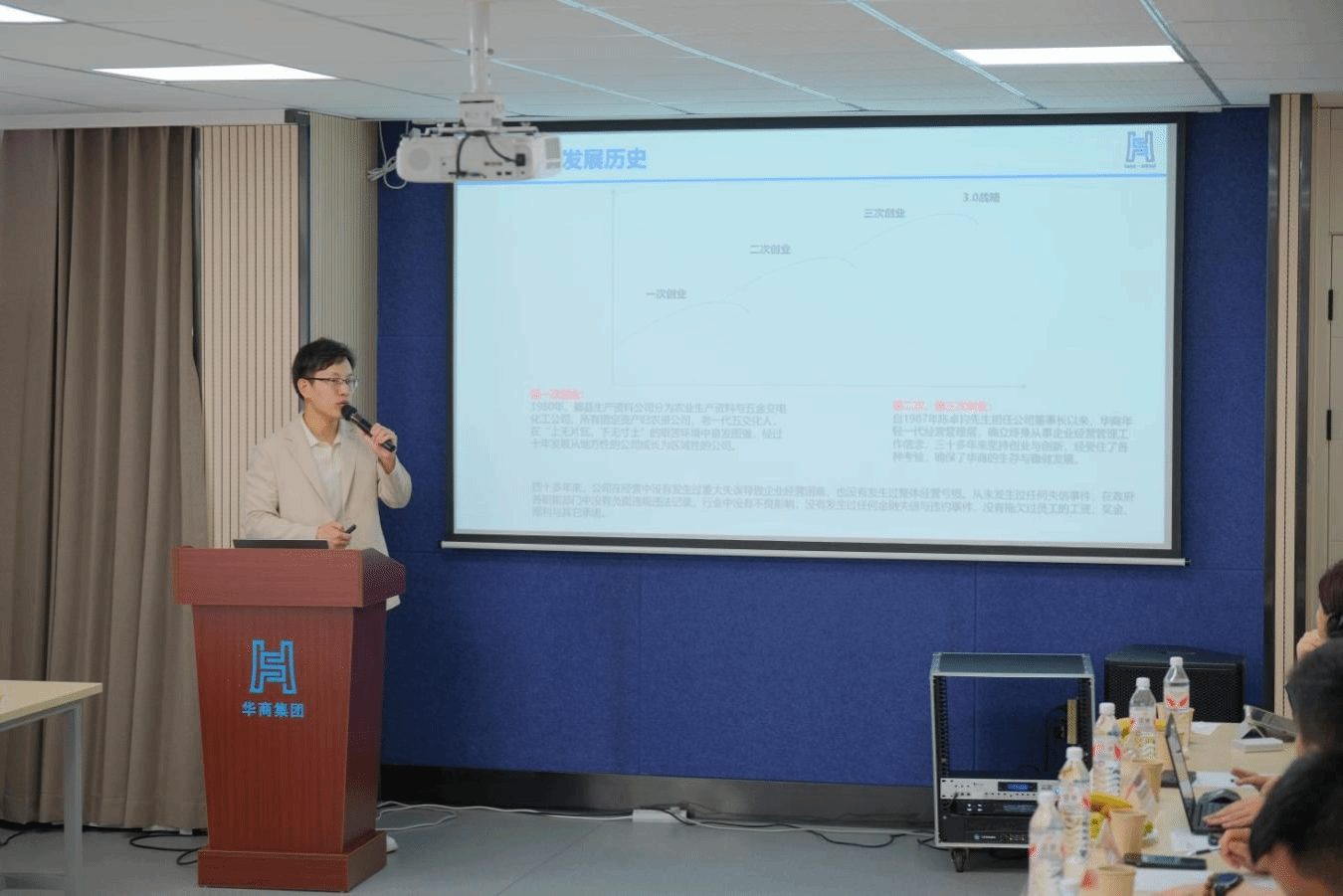 随后华商控股集团陈峰总裁做《华商集团文化与传承》主题分享。他首先梳理了华商集团的发展历程,通过关键节点的回顾,展现企业从创立到成长的阶段性成果,奠定文化传承的历史根基。接着讲述个人使命的传承:以先祖为鉴,践行社会责任。以陈哲森、陈哲吉等先祖为例,体现出回馈宁波、投身民族复兴的使命,设定短期 “百亿华商”、长期 “百年华商” 目标。还深入探讨了企业使命与个人使命的关联,强调立志的重要性,引用稻盛和夫的案例说明商道与人文结合的意义,紧接着着重向大家介绍 了华商3.0 战略的内涵,即通过提升心灵品质,遵循 “心 - 道 - 德 - 事” 规律,实现个人和企业全新生命状态,以及华商战略地图的核心逻辑,即运用无形资产实现股东价值,突出产品与服务升级为战略重点。最后陈峰总裁还分别向与会代表介绍了集团下属优秀企业代表:卓艺建设、华商供应链、华商智居、以及华商体育博彩 。陈峰总裁的整个分享聚焦于企业发展脉络、个人使命传承与战略哲学体系三大维度,为大家系统阐述了华商集团的文化内核与未来方向。