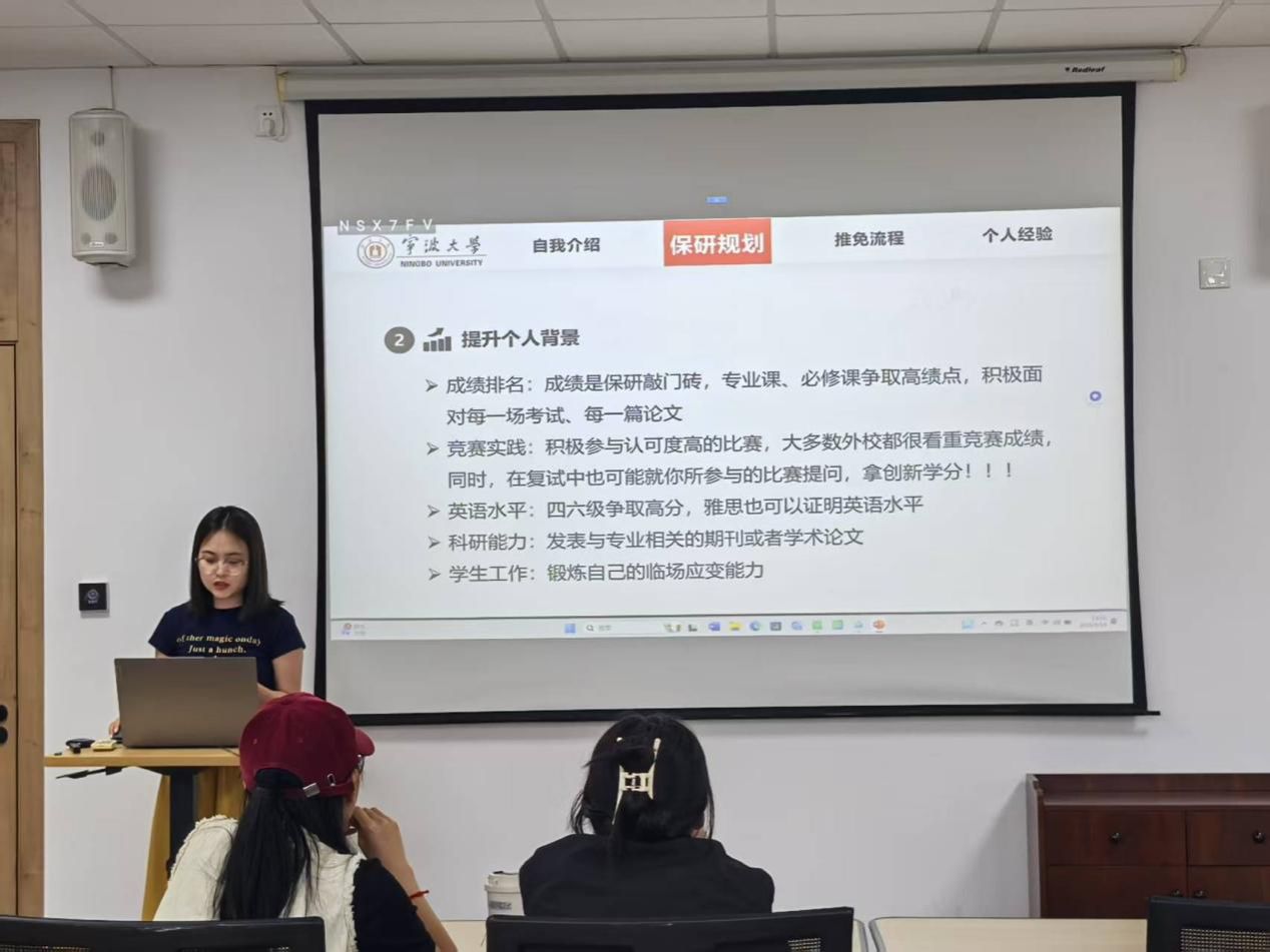 首先,就业辅导员马璐璐对两位同学进行了简单的介绍;其次,两位学姐介绍了保研流程,解读了宁波大学的保研政策,着重强调了绩点与创新学分、预推免和简历的重要性,从保研的准备工作,文书材料、专业课复习、参营论文,夏令营预推免投递等方面分享宝贵的经验。也建议同学们查看前几届的保研情况,对于保研更有把握。最后,互动交流环节,学姐们与同学面对面沟通交流 ,解答同学们的疑惑。