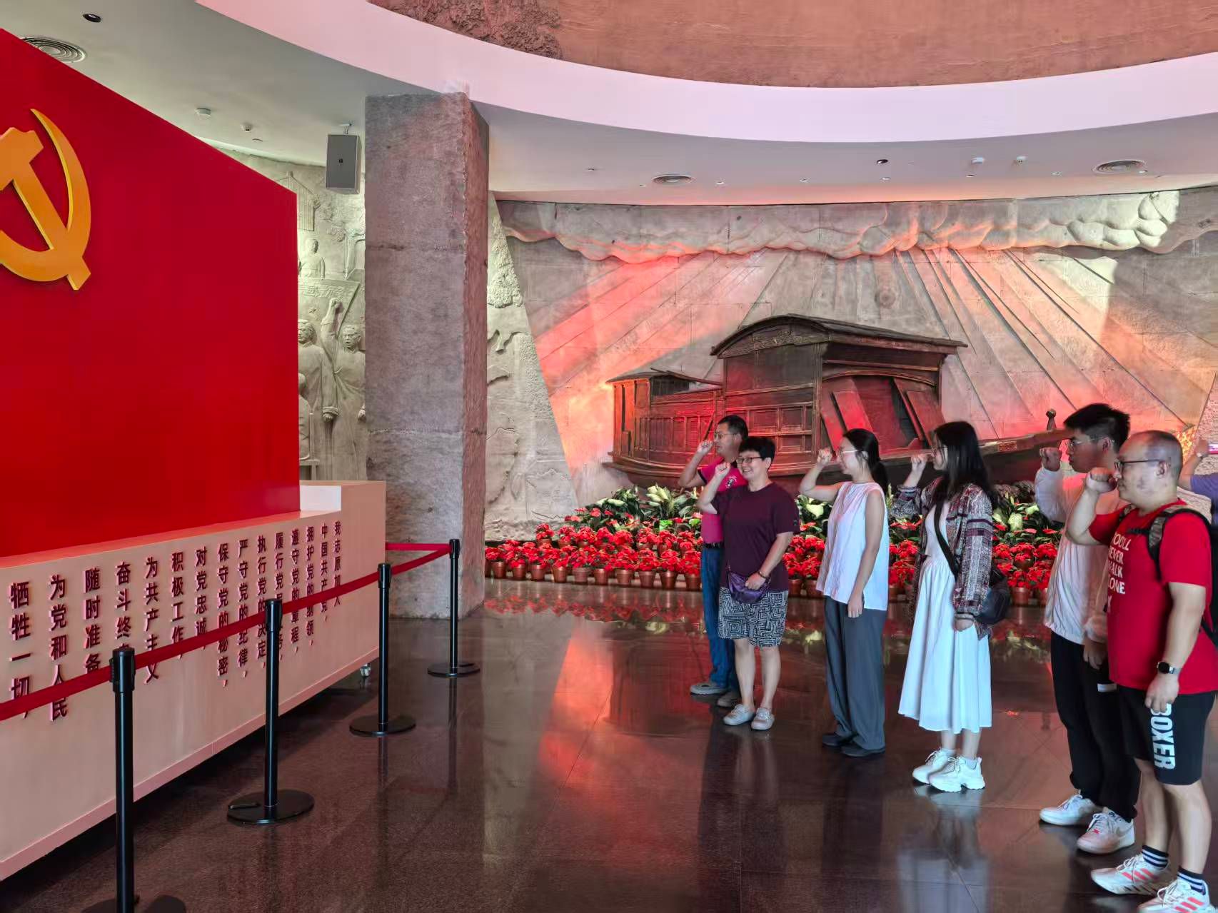 嘉兴南湖,是中国共产党的诞生地,也是“红船精神”的发源地。1921年,中国共产党第一次全国代表大会从上海转移至嘉兴南湖的一艘红船上胜利闭幕,庄严宣告中国共产党的诞生。此次主题党日活动以南湖革命纪念馆为核心,展开了全面的参观学习。纪念馆内,“救亡图存”、“开天辟地”、“光辉历程”、“走向复兴”四大展区,通过珍贵文物、历史照片和文献资料,全面展示了中国共产党从诞生到带领中国人民走向复兴的壮阔征程。支部党员们在纪念馆内仔细观看每一件展品,认真聆听讲解。从新文化运动、五四运动到中国共产党的建立,再到改革开放和社会主义现代化建设,一段段历史影像、一件件珍贵文物,将大家带回了那个风雨如磐的年代。在南湖革命纪念馆宣誓墙前,党支部书记徐荣华带领全体党员重温入党誓词。铿锵有力的誓言回荡在广场上空,彰显着党员们对党的无限忠诚与为共产主义事业奋斗终身的坚定决心。