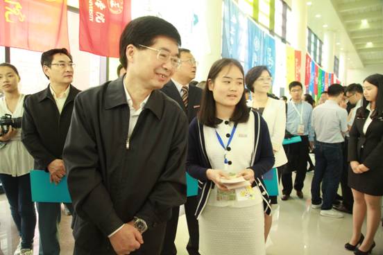 图为浙江省副省长郑继伟听取我院公益创业项目负责人介绍其参赛作品