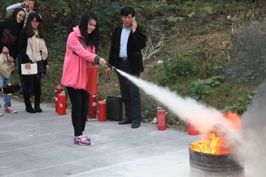 火盆熊熊燃烧, 参与演练的同学却毫不畏惧。站在火盆逆风口处,手持灭火器喷出浓浓的粉末,大火熄灭。一位男生再度点燃熄灭的火盆,下一个学生接着灭火,如此循环,让每一个同学都能做到正确使用灭火器。现场演练气氛热烈,同学们积极参与。