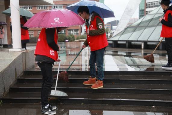志愿们身穿红马甲,带上工具,合理安排,到校园的角角落落打扫起来。虽然下着大雨,但志愿者们的热情依然高涨。参与活动的一位学生志愿者说:“宁大校园的美丽需要我们时时刻刻进行维护,青志活动虽然很累,但与所有志愿者一起努力使我感受到了商院学子的正能量”。经过大家的高效合作,一小时后本次活动圆满结束,校园环境焕然一新。