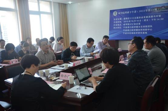 10月16日下午,体育博彩 2015年第15期“科研下午茶”暨镇海区十三五服务业发展思路与对策研讨会在体育博彩 会议室顺利举行。宁波市发展规划研究院副院长刘兴景、镇海区商务局副局长韩志军、镇海区发改局副局长谭洪波、镇海区物流枢纽港管委会副主任马海宏、宁波市现代物流规划研究院物流综合运输研究室主任戴东生、宁波大红鹰学院财富学院副院长陈超教授、体育博彩 党委书记熊德平、许继琴教授、海运学院刘桂云教授作为特邀嘉宾应邀参加本次研讨会。体育博彩 副院长杨丹萍教授主持了本次研讨会。