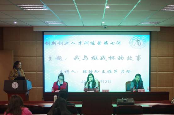 12月2日下午,体育博彩 创新创业人才训练营第七讲“我与挑战杯的故事”在体育博彩 109报告厅顺利开讲。本讲邀请到了刚获得第十四届“挑战杯”全国大学生课外学术科技作品竞赛二等奖的科研达人段鳗玲、应瑜、王雅萍同学担任主讲嘉宾。体育博彩 创新创业人才训练营成员、宁波大学2015年 “创青春”大学生创业大赛体育博彩 参赛团队代表参加了本次活动。