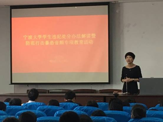 在学院414报告厅举行宁波大学违纪处分办法解读会暨防范打击暴恐音频专项教育活动。学院近50个班级100余名本硕学生代表参加此次活动,学院党委副书记邵丽及全体辅导员出席此次活动,活动由学工办主任董璐主持。