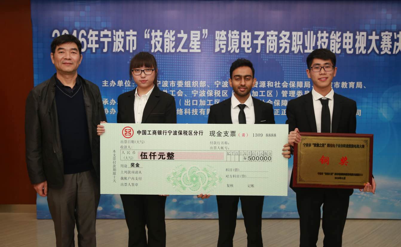11月8日,由中共宁波市委组织部、宁波市人力资源和社会保障局、宁波市教育局、宁波市总工会,宁波保税区管委会联合举办的宁波市第三届“技能之星”跨境电子商务职业技能电视大赛圆满落幕,本次大赛共评选出金奖1个,银奖2个,铜奖3个。我院中外学子组成的“孟想-(M-ideal)”参赛团队经过激烈角逐获得了大赛铜奖,队员分别是来自15级国际经济与贸易全英文专业的曹成栋、戴欣媛,16级工商管理(全英文)专业的成昱黄和13级国际经济与贸易专业的孟加拉国留学生Shadman。