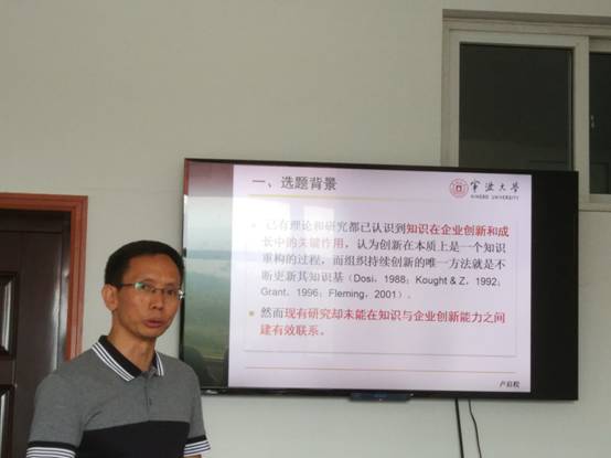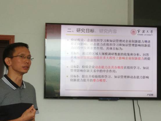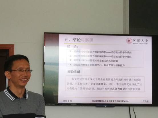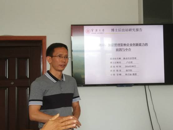 2017年9月24日上午10点,宁波大学渔业经济与管理博士后流动站卢启程博士后出站报告研讨会在11号楼103-2会议室举行。报告主题为“知识管理影响企业创新能力的前因与中介”,报告会由教育部特聘教授钟昌标教授主持,邀请了中国人民大学等校专家参与研讨,体育博彩 20余名老师和研究生参加了此次活动。