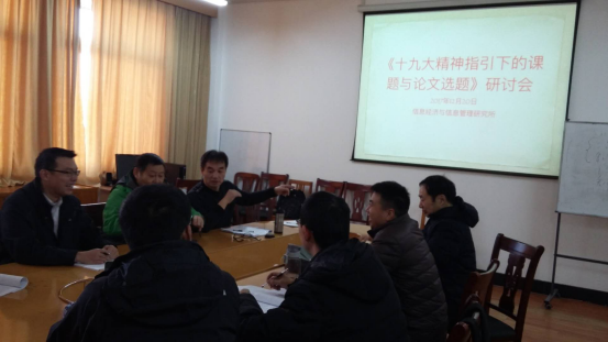 本次研讨会主题是十九大精神指引下的课题与论文选题申报。信息经济与管理研究所所长谢友才教授做了题为“如何结合新时代特点有效开展课题与论文选题申报”的主题报告。
