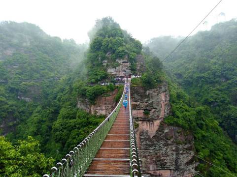 穿岩十九峰风景名胜区由穿岩十九峰、千丈坑、台头山、倒脱靴四个景区组成,是我国壮丽的丹霞地貌景区之一。景区以自然风光取胜,适宜游览、度假、登山、探险、水上活动等多种特色旅游。“穿岩之峰高苍苍,峰峦十九摩天光”。到达景点时,虽下着小雨,云里雾里恍若仙境。尤其在千步云梯空中栈道处步步惊心,别有一番滋味在心头。