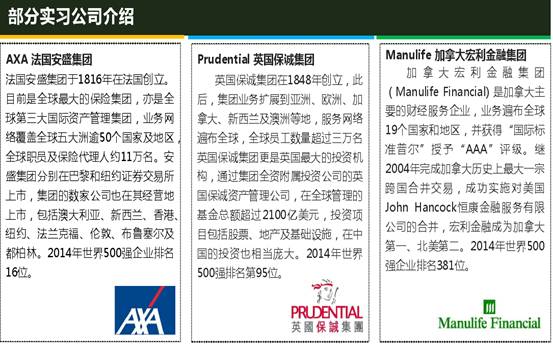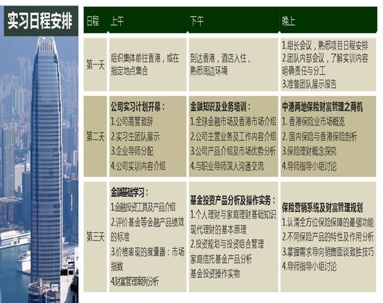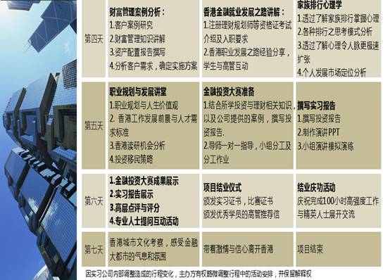 世界500强实习计划计划是由香港著名的金融集团进行的新一代企业家实战训练项目,由金融知识与业务培训、企业业务实操、职业规划指导、财富管理案例分析、模拟操盘训练、投资报告大赛等重要元素构成,有全球著名的财富管理人员为大家讲授金融相关课程,包括银行业、基金、人寿保险的高管课程,掌握第一手的理财知识,了解国际理财行业的最新动态以及工作范畴,将理论和实际有效结合,既是对国际商业和金融学的实践延展,也是对跨国名企的实证考察。学员不仅可以获得企业高管推荐信和实训证明,还能收获独一无二的香港工作体验,尽早明确职业定位,提高职业素质,增强在未来求职中的竞争力。